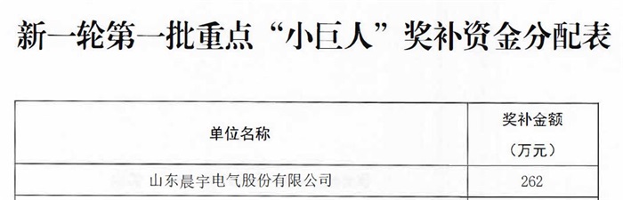 2022年公司入選國家第四批專精特新“小巨人”企業,2024年晨宇電氣憑借技術研發實力、自主創新能力榮耀上榜,成功躋身國 家級專精特新重點“小巨人”企業行列。此次入選國 家級專精特新重點“小巨人”企業,更加證明了晨宇電氣優良的科技實力。